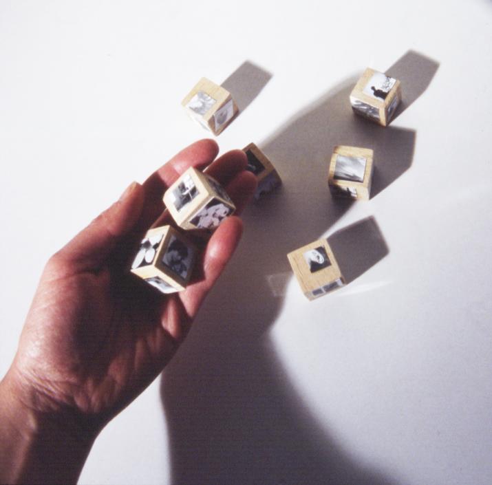 Photographies marouflées sur cubes de bois bois, photographies dim. variables dim. de chaque cube: 3/4"x3/4"x3/4"
